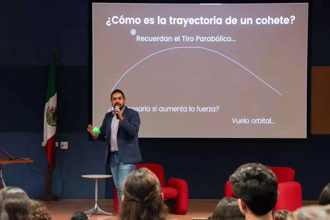 Durante la conferencia “Física de los cohetes”, el físico Marcos Gómez expuso los cálculos requeridos para el lanzamiento de cohetes y destacó que son cruciales para el éxito de las misiones espaciales.