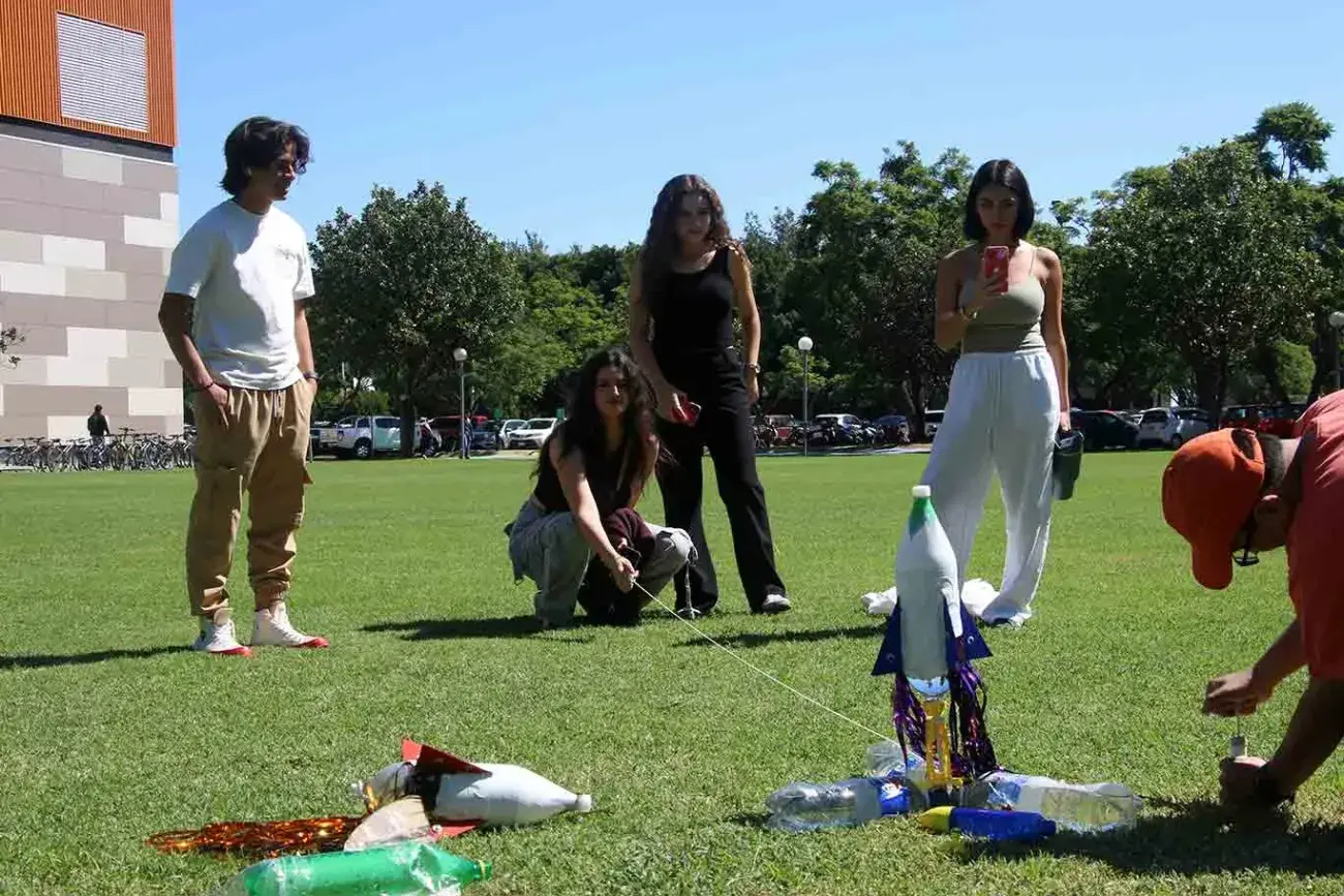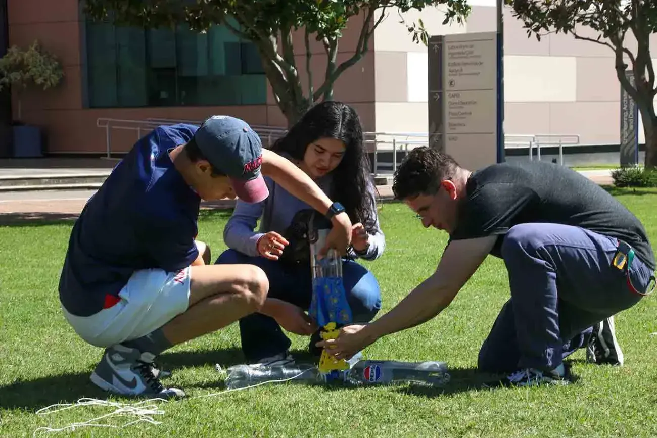 “Las botellas tienen la suficiente agua para simular el combustible del cohete, y con una bomba de aire generamos presión para crear un impulso y así imitar el lanzamiento de un cohete”, explicó el profesor de física.
