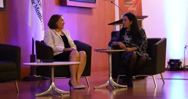 Claudia Félix, Vicepresidenta de la Región Occidente del Tec (al micrófono) y Lizette Hueso, académica de emprendimiento del Tec, durante el panel para presentar el libro.