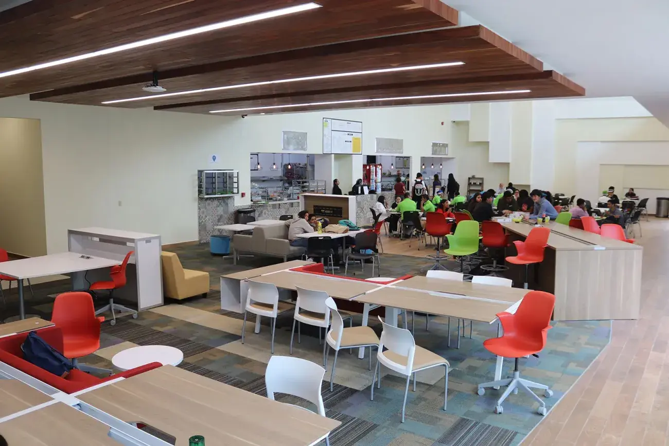 El Centro Estudiantil, es un edificio de 1300 m2, de dos plantas; la planta baja cuenta con una zona de comida, espacio de coworking, comedor ejecutivo, y TecStore. La planta alta cuenta con dos terrazas y próximamente con una área lúdica, con videojuegos, futbolito y hockey de mesa.