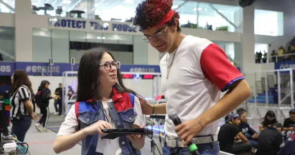 “¡Bienvenidos a la final de FIRST Robotics Competition!”, esa es la frase que más le cuesta decir a Pepe porque es la primera, pero después de eso, presenta sin dificultad a Samantha, la maestra de ceremonias en el torneo regional en campus Puebla del Tec de Monterrey.
