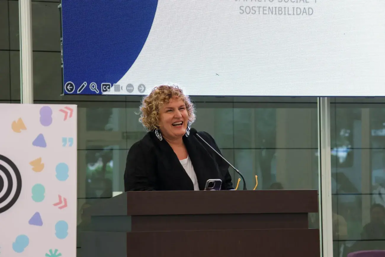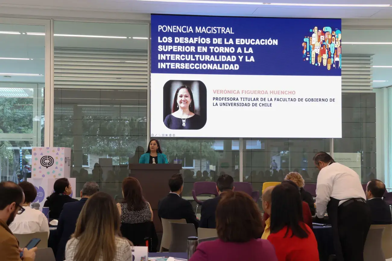 Verónica Figueroa, profesora titular de la facultad de gobierno de la Universidad de Chile, brindó una ponencia titulada "Los desafíos de la educación superior en torno a la interculturalidad y la interseccionalidad".