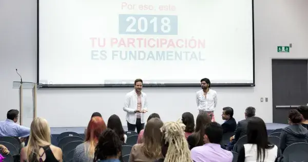 Armando Regil Velasco, egresado de la Licenciatura de Negocios Internacionales del Tecnológico de Monterrey Campus Querétaro y CEO de i2school School of Transformative Leadership, en compañía de Pablo Marín Escobar, egresado de la Licenciatura de Creación y Desarrollo de Empresas del Tecnológico de Monterrey Campus León, y CEO de Blinkfirm, presentaron la conferencia “Libertad y liderazgo creativo para transformar a México”, con la cual esperan generar conciencia entre los alumnos del Tecnológico de Monterrey para desarrollar ciudadanos activos y exigentes, así como promover el voto informado.