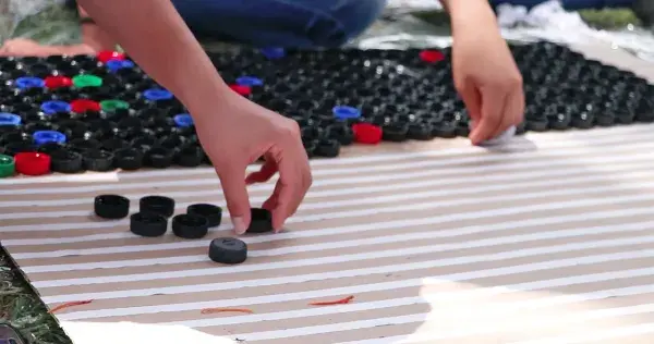 Un mural hecho con tapitas de plástico