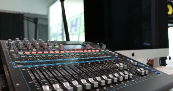 Cabina de radio: equipada con micrófonos, consola y acústica de estudio de grabación profesional.