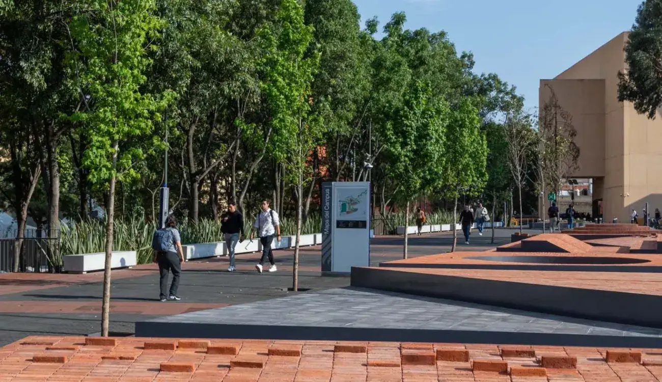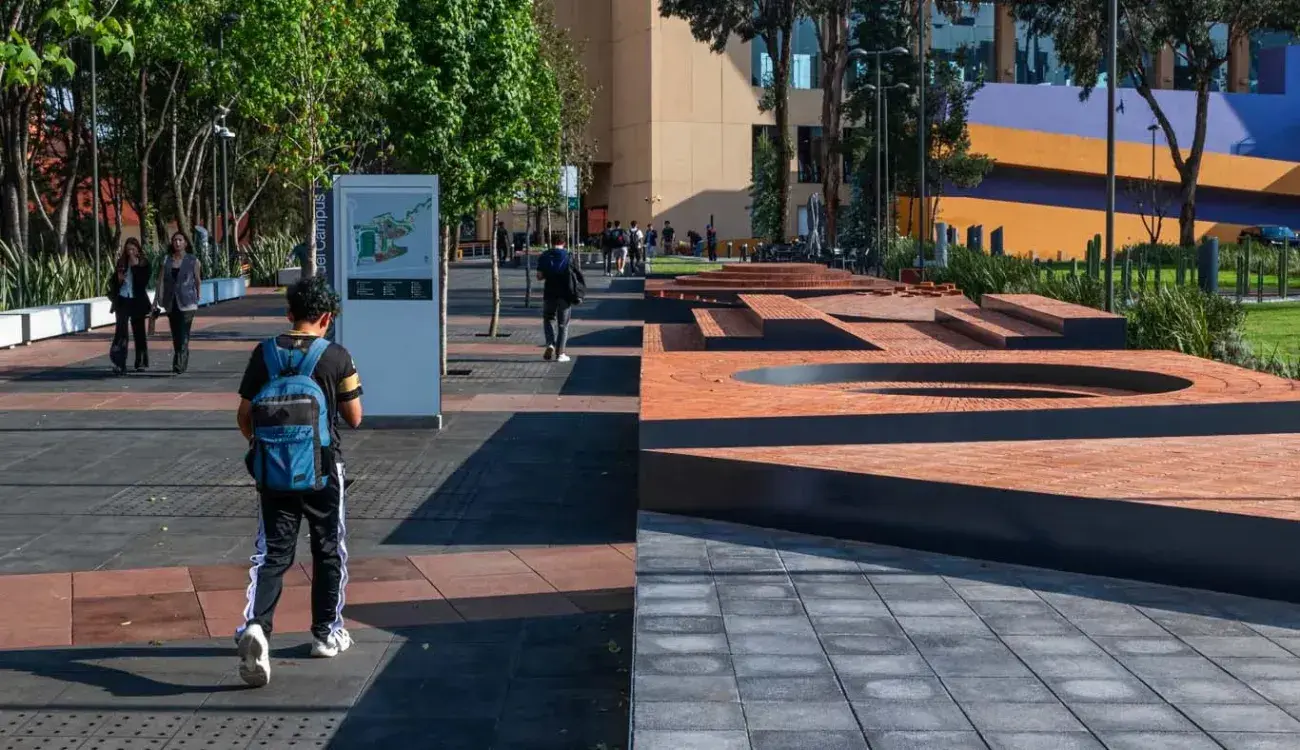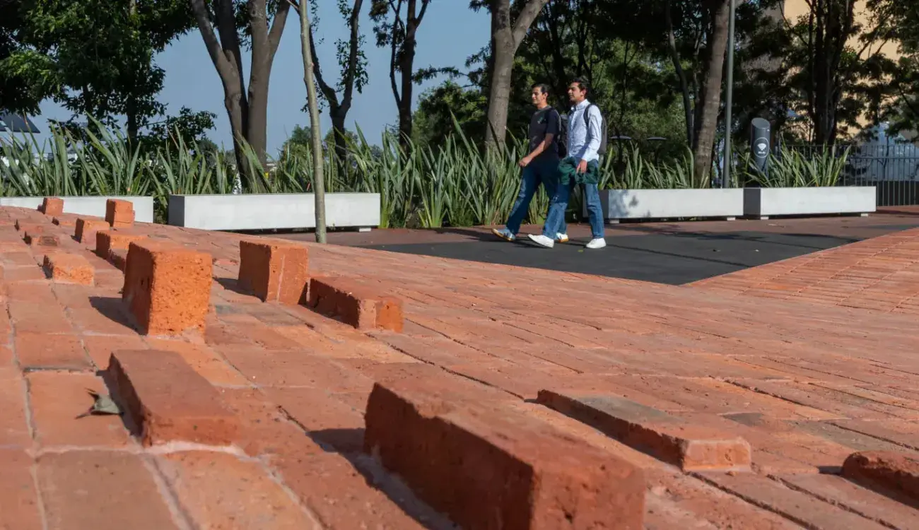 “Primero, un eje peatonal que conecta algunos de los edificios más importantes del campus. Segundo, un área con plataformas de tabique diseñadas para ser espacios lúdicos y de interacción al aire libre.